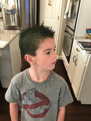 Crazy hair day! Alex wanted half red and half green. He couldn't even ride his bike to school so he wouldn't mess it up with his helmet.